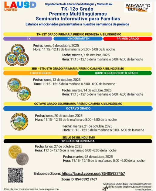 Si su hijo/a habla un idioma distinto del inglés, tiene la oportunidad de obtener el Sello de Bilingüismo. Infórmese asistiendo a una de las siguientes reuniones de Zoom del distrito.
