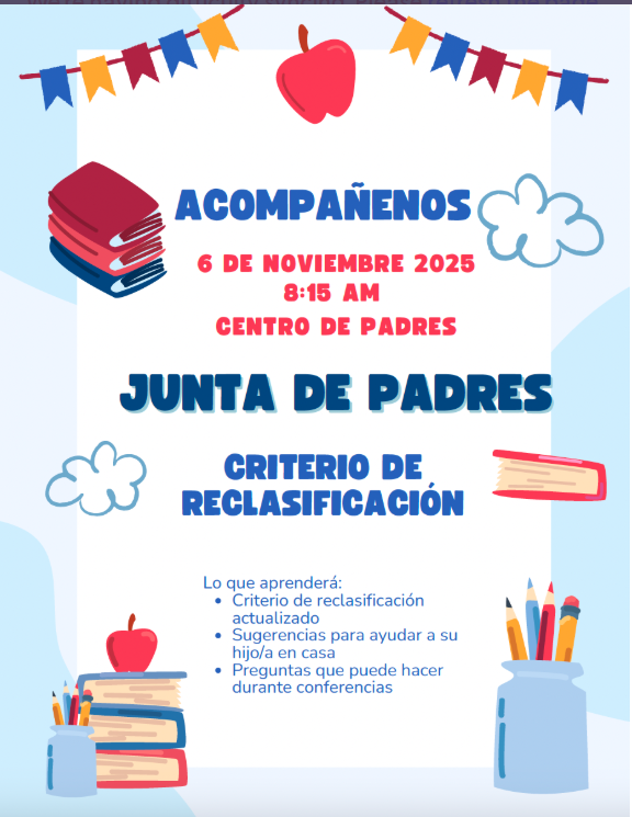 Join us on November 6, 2025 at 8:15a.m. in the Parent Center for a workshop on the updated reclassification criteria for English Learners!